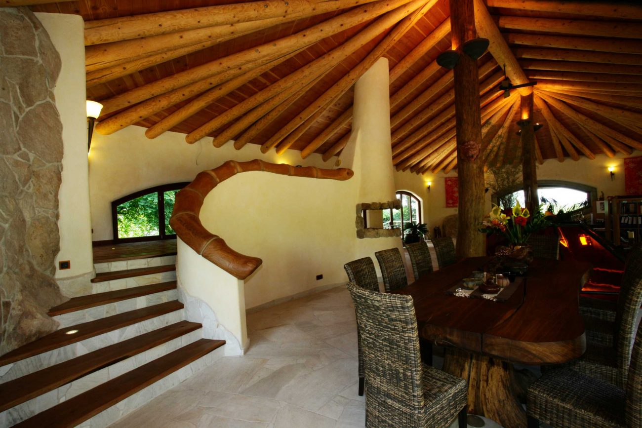 Allein das Dach … getragen von zwei kräftigen Spessarteichenstämmen, stützen weitgehend unbearbeitete, sichtbare Fichtensparren die wellenartige Erscheinung mit dem runden Schornstein. Ohne Regenrinne ergießt sich das Wasser des Regensaums rund um das Haus in ein breites, reizvoll gestaltetes Kiesbett – ein inszeniertes Naturerlebnis.
